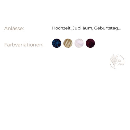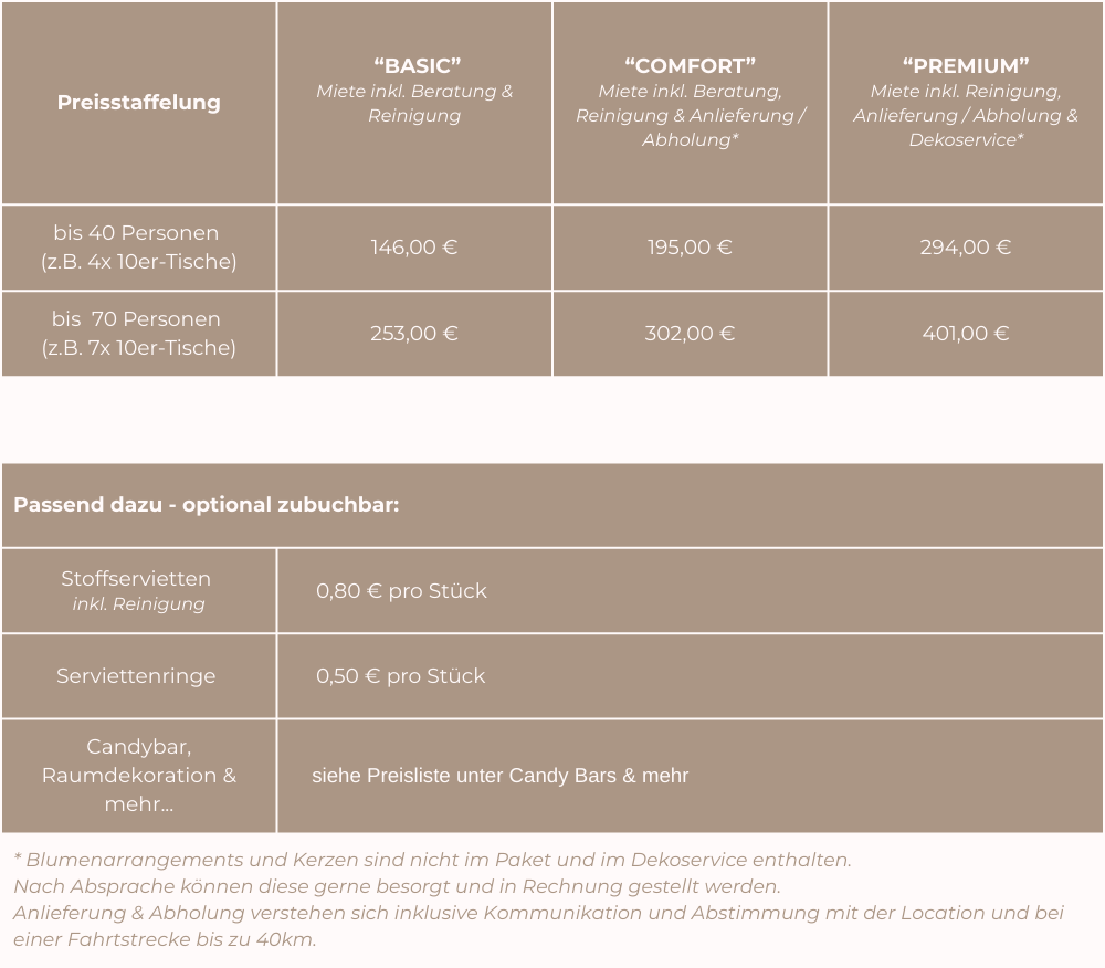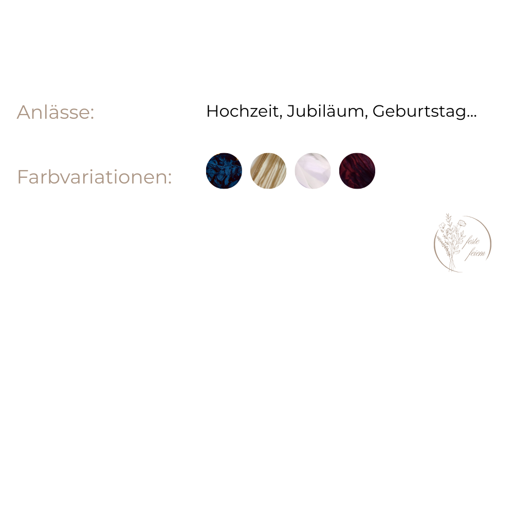Ihr könnt das Paket nach euren Wünschen und dem Farbkonzept eurer Feier anpassen. Gerne beraten wir euch hierbei.